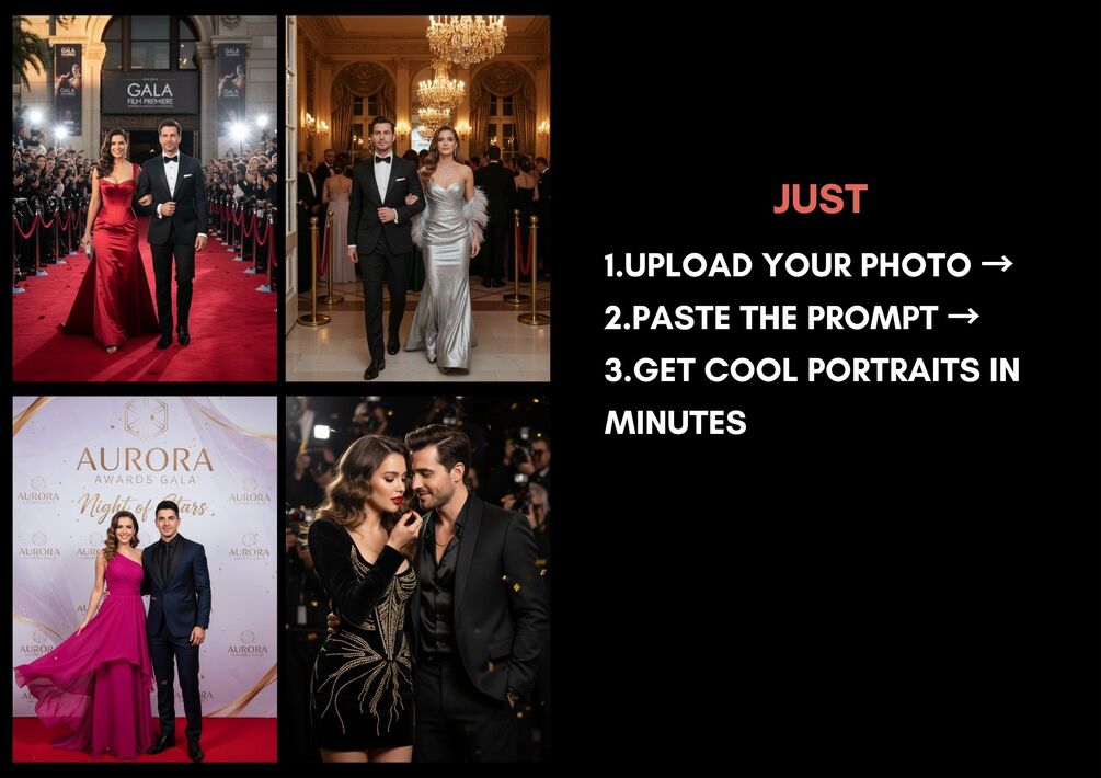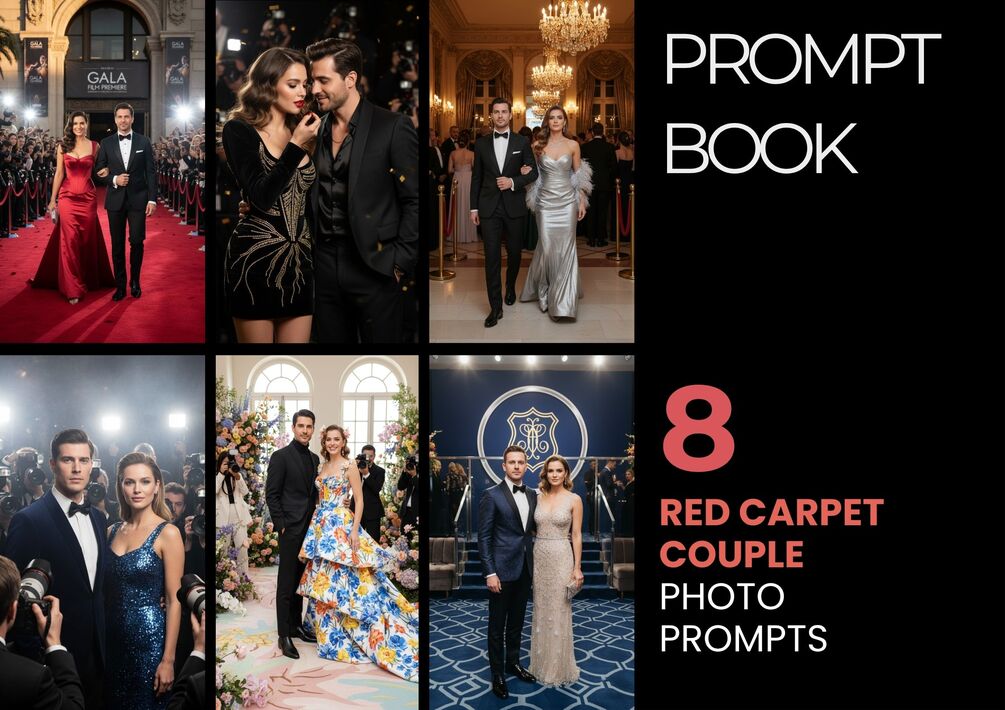 This AI prompt pack includes 8 red carpet couple photo prompts inspired by celebrity galas, premieres, and award nights. Perfect for creating stylish, cinematic portraits with luxurious atmosphere — no studio or photographer needed.